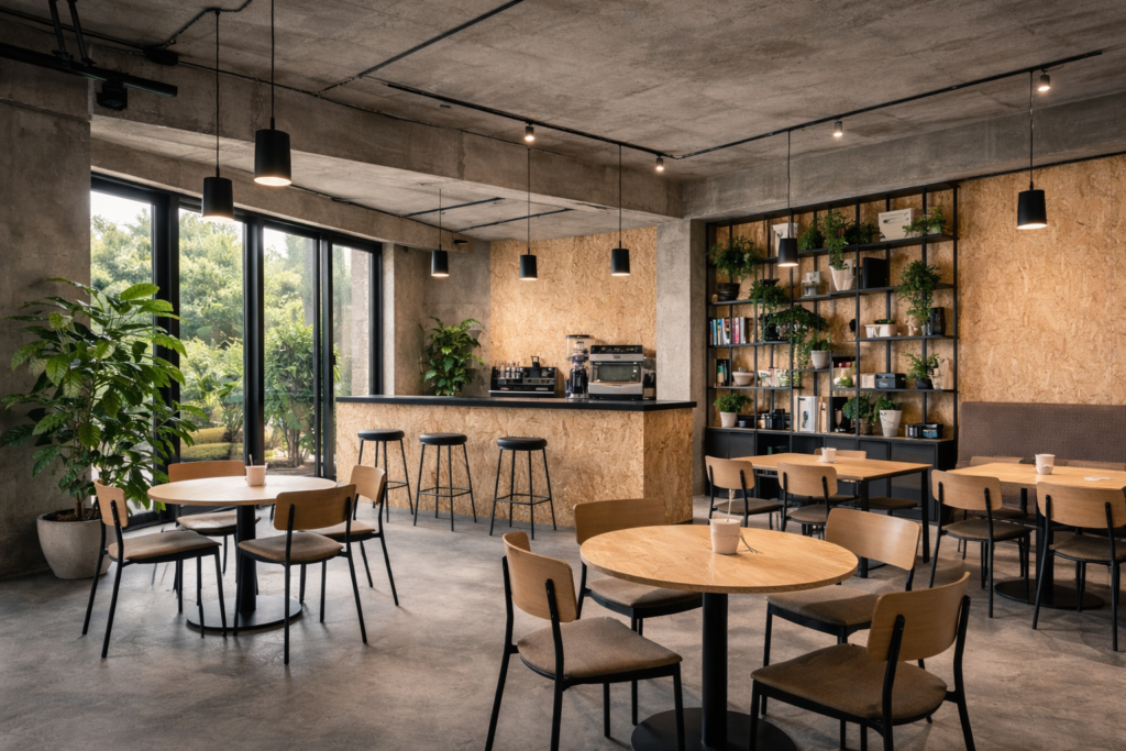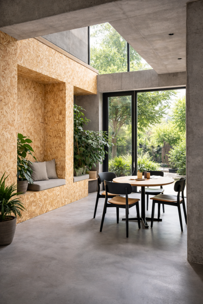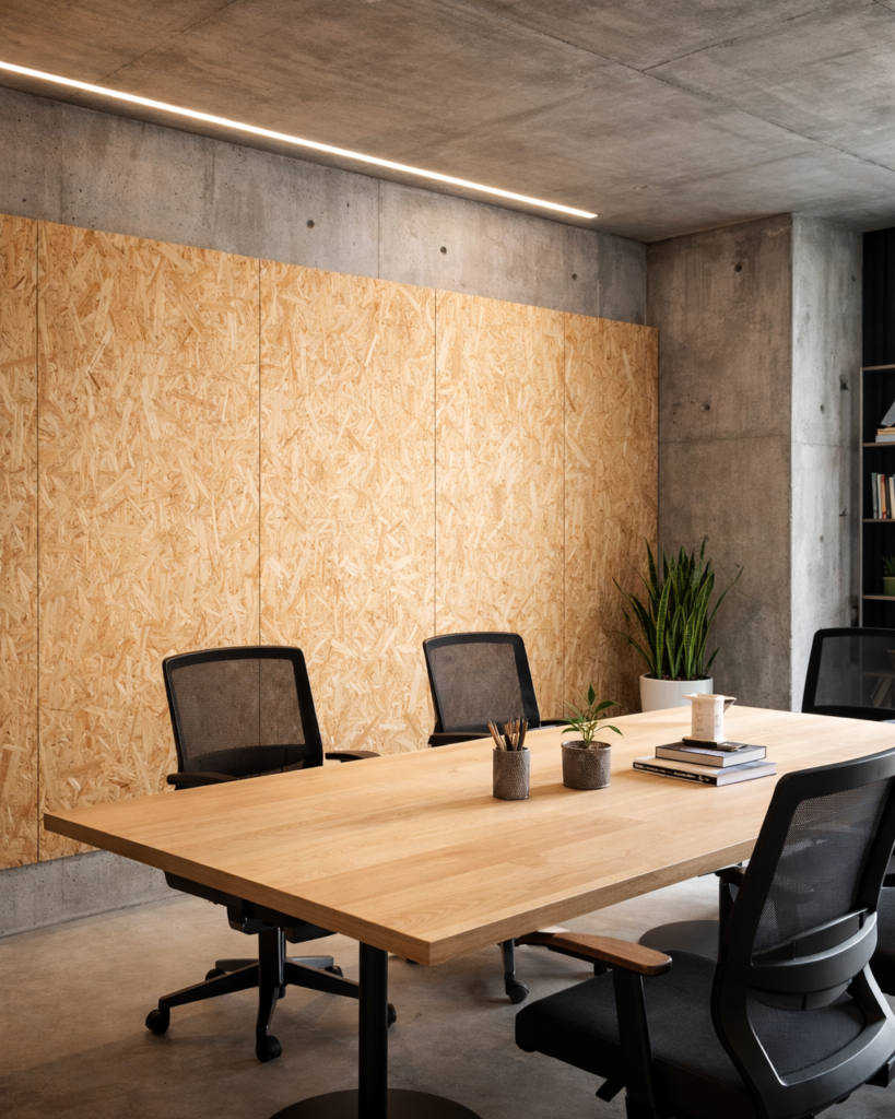 Pendekatan ini sering digunakan pada interior komersial. Kafe, restoran, dan studio kreatif banyak mengadopsi gaya ini. OSB menjadi alternatif kayu solid yang lebih efisien.